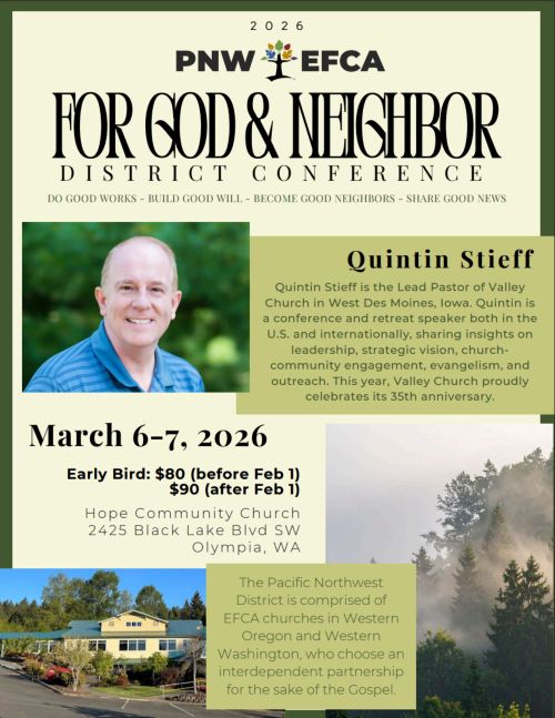 Each year the whole district comes together the first weekend of March. This conference is designed to challenge and encourage you, your staff, as well as others in your congregation. The two day conference includes main sessions, worship, meals, breakout sessions, networking with other churches and EFCA ministries, as well as the important district affirmation of the board and district budget.